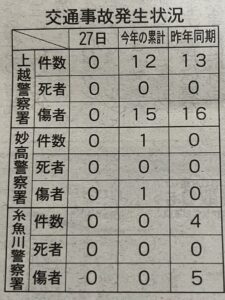 上越市の交通事故発生状況1/27現在